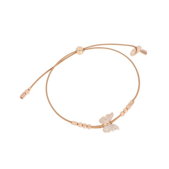 Bracciale di filo di nylon beige della Collezione Le Farfalle realizzato in argento 925 con galvanica oro rosa ad alto spessore e resistenza. La farfalla tridimensionale è smaltata di bianco e misura 10 mm in altezza. Il bracciale può essere regolato fino ad un massimo di 21 cm.