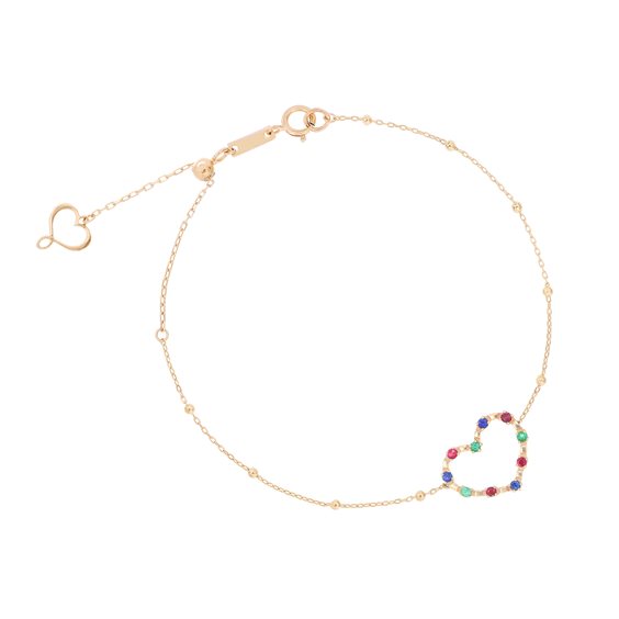 Bracciale Mon Coeur in oro rosa 18 carati e cuore piccolo con diamanti. Il bracciale presenta una catena in oro rosa 18 carati con piccole sfere. Al centro del bracciale è presente una sagoma di cuore piccolo che misura 12,6 mm in larghezza e 10,3 mm in altezza. Sulla superficie del cuore sono presenti Zaffiri, Smeraldi e Rubini e a una estremità della catena è presente un cuore Maman traforato. I diamanti naturali presentano le seguenti caratteristiche di qualità. Colore: G+ Purezza: sì La lunghezza del bracciale è regolabile in tre misure: 16 cm, 18,2 cm e 18,7 cm. Chiusura con anello a molla.