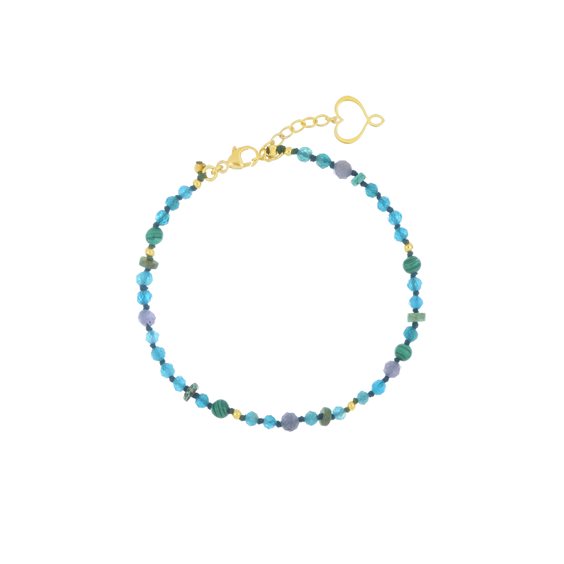 Bracciale in argento 925 con galvanica oro giallo ad alto spessore e ad alta resistenza. Il Bracciale è ricoperto per tutta la sua superficie da pietre di apatite, aulite turchese, malachite, tanzanite in diverse dimensioni alternate a nodi e sfere decorative. Può essere regolato da un minimo di 18 ad un massimo di 21 cm. Cuore Maman traforato all'estremità. Chiusura a moschettone.