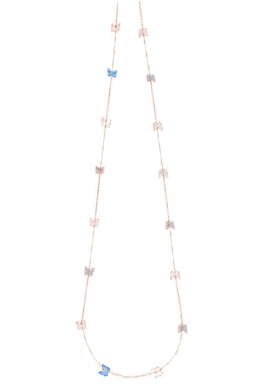 Collana della Collezione Le Farfalle con sedici farfalle realizzata in argento 925 con galvanica oro rosa ad alto spessore e ad alta resistenza. La lunghezza della collana è di 89 cm e indossata è di circa la metà. Le farfalle presenti sulla collana misurano 10 mm e si alternano tra due farfalle azzurre, nove bianche e cinque azzurro chiaro.Chiusura a moschettone.