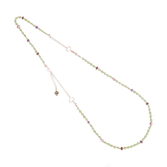 Collana- bracciale compo realizzata in argento 925 con galvanica oro rosa ad alto spessore e resistenza. Lungo la superficie sono presenti elementi decorativi come sfere e pietre di Peridoto verde, Ametista viola, Tormalina rosa e Rubino rosso. La peculiarità di questo oggetto è che può essere indossato in tre modi diversi. Può essere indossato come collana lunga di 67 cm oppure, sganciando i due moschettoni, si ottengono un girocollo di 45 cm e un bracciale di 22 cm. Sono presenti due moschettoni e due cuori Maman. Questo articolo è composto da GCISF2PR e da BRISF2PR che possono essere acquistati separatamente. Chiusura a moschettone.