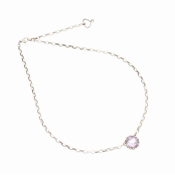 Girocollo Elizabeth realizzato in argento 925 brunito. Il girocollo presenta un castone con intreccio di cuori Maman che accoglie un'Ametista rosa di 1 cm di diametro posizionato al centro. Il girocollo è composto da una catena con maglia rolò diamantata. Il girocollo è regolabile da un minimo di 35 cm fino ad un massimo di 42 cm. È presente il cuore Maman traforato alla fine del bracciale. Chisura a moschettone.