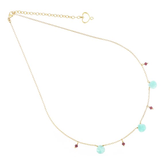 Girocollo realizzato in argento 925 con galvanica oro giallo ad alto spessore e resistenza. Il girocollo può essere regolato da un minimo di 37 cm fino ad un massimo di 44 cm e presenta quattro pietre di granato e tre gocce di amazzonite celeste. Inoltre è presente il cuore Maman traforato. Chiusura a moschettone.