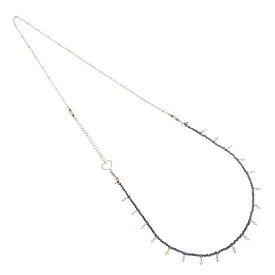 Collana con pietre di Zaffiri e gocce di Perla pendenti realizzata in argento 925 con galvanica oro rosa ad alto spessore e resistenza. La collana può essere regolata da un minimo di 54,5 cm fino ad un massimo di 61,5 cm. Cuore Maman smaltato di nero. Chiusura a moschettone.