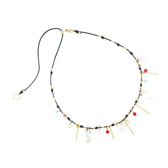 Girocollo di filo di nylon nero con elementi decorativi in argento 925 placcato in oro giallo ad alto spessore ed alta resistenza, pietre pendenti di corniola, peridoto e pasta di turchese e cinque soggetti animali smaltati in bianco. La dimensione della circonferenza è regolabile grazie alla piccola sfera rivestita in argento placcato oro giallo da un minimo di 33 cm ad un massimo di 48,5 cm. È presente il cuore Maman all'estremità del girocollo. Chiusura a moschettone.