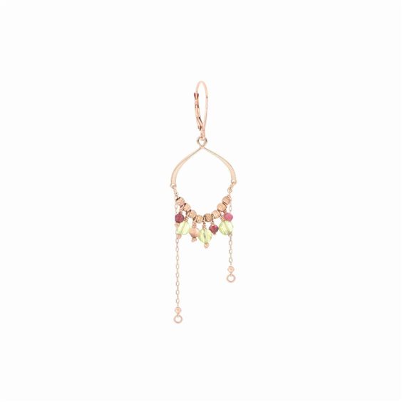 Orecchino a monachella singolo realizzato in argento 925 con galvanica oro rosa ad alto spessore e resistenza. L'orecchino presenta una sezione di cuore Maman capovolto, pietre di Tormalina rosa, Granato rosso, Peridoto verde, sfere decorative e due catene pendenti. La lunghezza totale dell'orecchino è di 65 mm.