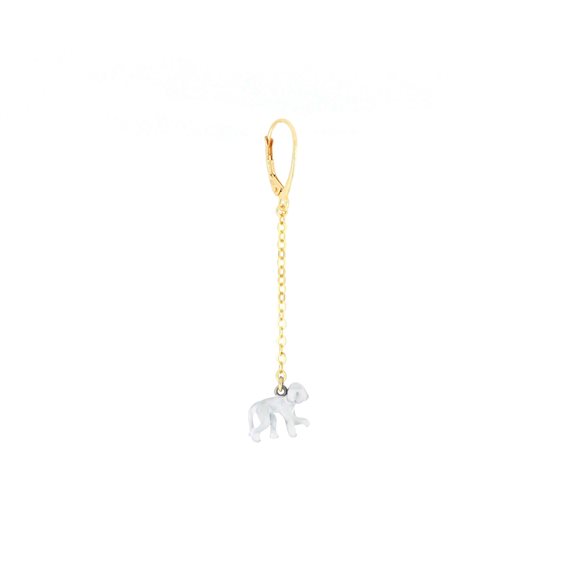 Orecchino a monachella in argento 925 con galvanica oro giallo ad alto spessore e resistenza. L'orecchino presenta un elefante pendente smaltato in bianco. Lunghezza totale dell'orecchino 55 mm