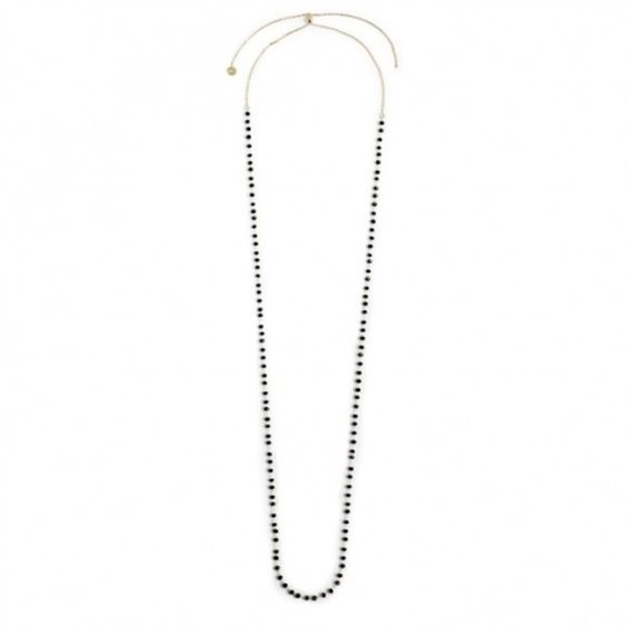 Collana in acciaio con PVD oro con cristalli neri sfaccettati 3 mm con logo tag Marlù 6 mm e chiusura a scorrimento. Lunghezza collana 90 cm, regolabile. Collezione: Basi Materiali: acciaio con PVD oro e cristalli