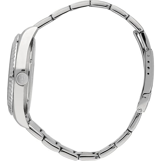 Orologio da uomo con movimento al quarzo Miyota 2415 e funzioni di solo tempo con data. Cassa in acciaio inox dal diametro di 43 mm. Lunetta zigrinata. Quadrante analogico silver con indici a bastoni blu, logo a ore 12 e datario a ore 3 con lente di ingrandimento. Fondello e corona a vite per garantire maggiore impermeabilità. Cinturino in acciaio anallergico; chiusura deployante con pulsanti. Resistente all'acqua fino a 100 metri di profondità.