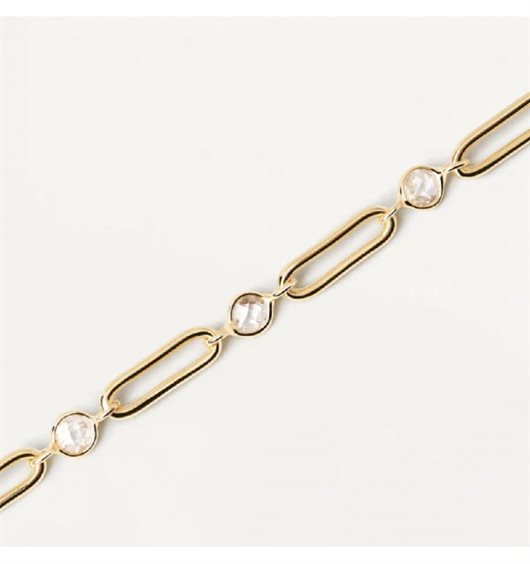 Braccialetto da donna realizzato con catena a maglie ovali in argento 925% con finitura dorata e intervalli con zirconi bianchi dal diametro di 3 mm. Ha lunghezza totale di 18 cm, regolabile. Ha peso di circa 3,40 g.