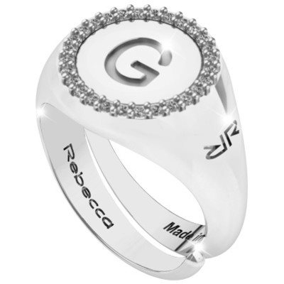 Anello In Argento 925 E Zirconi Con Lettera Da Donna Della Marca Rebecca, Gioiello Della Collezione Myworldsilver. Anello Chevalier In Argento 925 Con Lettera G Incisa. L'Anello È Impreziosito Da Un Pavè Di Zirconi E Dal Logo Rebecca Inciso Sul Profilo Laterale. L'Anello Ha Misura S, Ovvero È Regolabile Dalla Taglia 7 Alla 12.