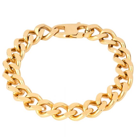 Bracciale Groumette in bronzo placcato oro con catena grumetta a maglia media. Lunghezza 20 cm circa. Chiusura con moschettone con logo Rebecca in incisione.