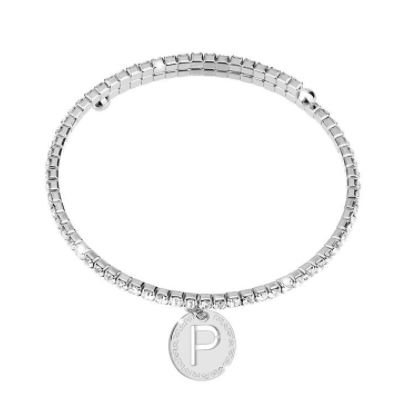 Bracciale rigido, elastico, aperto in bronzo rodiato con zirconie scintillanti e iniziale tonda.