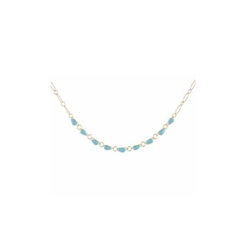 Collana Tulipe girocollo in bronzo placcato oro con 9 pietre celesti. Lunghezza regolabile fino a 43 cm circa.
