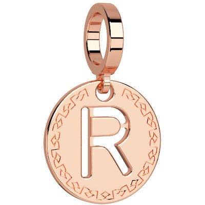 Charm in bronzo laminato oro rosa di forma circolare con lettera dell'alfabeto traforata incorniciata da una greca incisa e logo Rebecca. Un cordino in cotone cerato di colore nero per questo charm è incluso nel prezzo: acquista la tua lettera e lo riceverai in regalo.