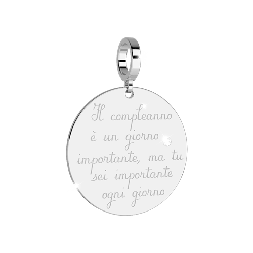 Questo ciondolo in bronzo rodiato anallergico è dedicato al COMPLEANNO. Il diametro del disco è di cm.2. Un cordino in cotone cerato nero è incluso nel prezzo: fai il tuo acquisto lo riceverai in regalo.