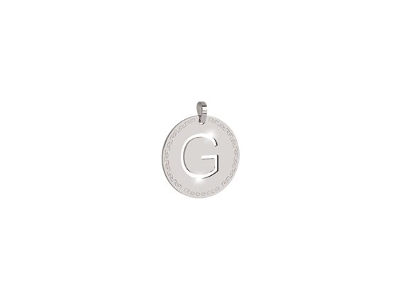 Charm in bronzo rodiato anallergico, al cui centro è presente una lettera incorniciata circolarmente da un motivo a greca con il logo Rebecca. La collana per questo charm è inclusa nel prezzo: acquista la tua lettera e la riceverai in regalo.