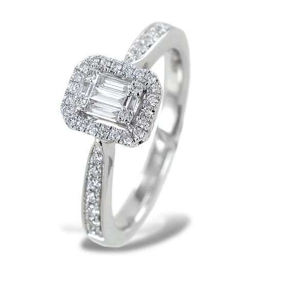 Anello della collezione Magia in oro bianco con diamante centrale a taglio baguette di caratura 0,10 di colore G e con diamanti a taglio rotondo nel contorno e nel gambo di caratura 0.20 di colore GH.