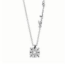 DAPHNE: una collezione di gioielli con protagonisti i diamanti Collezione di gioielli storica della maison Salvini, tra le più amate grazie ad un mix equilibrato e perfetto di tutte le caratteristiche che fanno di un gioiello un pezzo unico, splendido, desiderabile. Protagonisti i diamanti, nella loro essenzialità e preziosità. Impossibile per qualsiasi donna non cedere al loro fascino: così come il dio Apollo, colpito dalla freccia di Eros, si innamorò della bella ninfa Daphne. La collezione di gioielli Daphne è un trionfo di oro bianco e diamanti dalla particolare incassatura e luminosità. Dal tradizionale anello con uno o più elementi, alla gamma di collier con catena logata, ai punti luce orecchini e pendenti con due, tre o cinque elementi, tutti i gioielli di questa collezione Salvini incantano per lucentezza e preziosità.Collier in oro bianco 18kt con pendente, diamanti taglio brillante di ct.0,49 complessivi. Logo 'Salvini' inserito nella collana