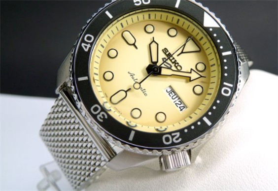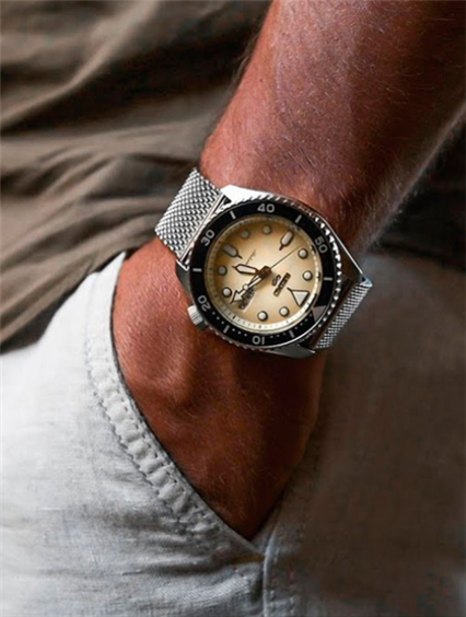 Orologio uomo seiko, Sport suits SRPD67K1 Royal Cream , collezione 5 sports, movimento automatico, cal seiko 4r36, riserva di carica 41 ore , cassa acciaio 42.5 mm. quadrante Crema con indici luminosi lumibrite, ghiera girevole unidirezionale , vetro minerale hardlex, bracciale in maglia milano, impermeabile fino a 10 bar Cassa Acciaio.