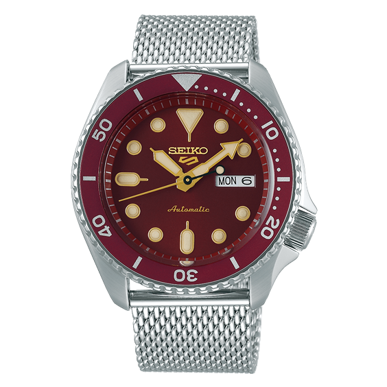 COLLEZIONE: 5 Sports MOVIMENTO: Automatico con capacità di carica manuale CASSA: in Acciaio inox FONDELLO: a vite e trasparente QUADRANTE: bordeaux, lancette e indici con LumiBrite DIAMETRO: 42,5 mm VETRO: in Hardlex (cristallo minerale temprato) BRACCIALE: maglia milano FUNZIONI: arresto lancetta dei secondi RISERVA DI CARICA: 41 ore IMPERMEABILE FINO A 10 bar (100m) –