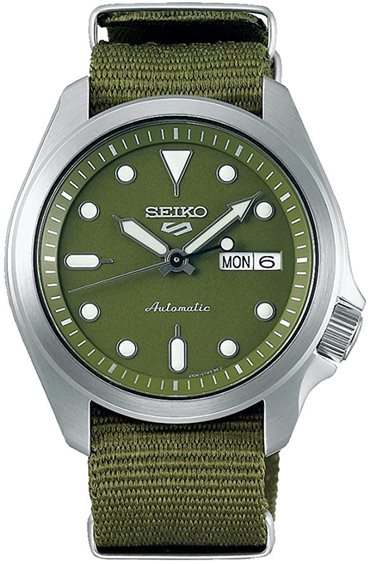 Semplicità e comfort nei modelli Seiko 5 sport. Diametro di cassa di soli 40mm. spessore ridotto al minimo per contenere lo spettacolare movimento 4R36, 24 rubini 21600 alternanze ora,riserva di carica di oltre 41ore.Lunetta sottile per conferire uno stile minimal, perfetto in ogni occasione, adatto a qualsiasi polso. Design pulito ed essenziale, puoi divertirti ad applicare bracciali in gomma, acciaio o come in questo caso bracciale "nato" verde, -multi resistente. Fondello avvitato con vista movimento, vetro Hardlex ad alta resistenza, indici e sfere con lumibrite per una visione notturna. Corona a pressione con funzioni carica/cambio data/fermo macchina. Seiko 5 sport: le cinque caratteristiche della linea: movimento automatico/visualizzazione giorno e data/wr. 10bar/corona a ore 4/cassa e bracciale costruiti per resistere e durare.