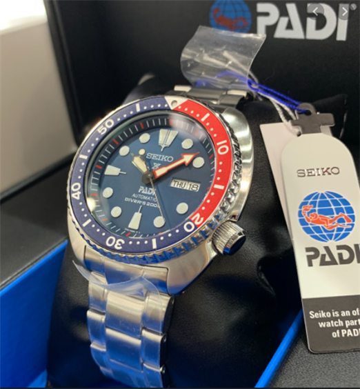 Orologio subacqueo professionale. Movimento a carica automatica con opzione carica manuale 4R36. tre sfere, giorno data, frequenza 21600 alternanze/ora, 24 rubini, riserva di carica di oltre 41 ore. Corona e fondello a vite W.R 200metri, ghiera girevole unidirezionale con trattamento IP. blu e rosso. Indici e sfere con trattamento LUMIBRITE per visione al buio. EDIZIONE SPECIALE PADI CON ASTUCCIO DEDICATO. Vetro Hardlex, doppia chiusura con sicurezza e possibilità allungo per indosso su muta sub.