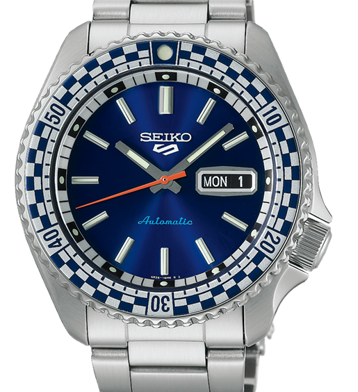 Edizione Speciale con scritta riportata sul fondello. design "checker flag" bandiera a scacchi. movimento a ricarica automatica seiko 4R36 robusto ed affidabile. doppio datario giorno e data corona di ricarica a ore 4 W.R 100metri corona a pressione con guarnizione protettiva impermeabilità. fondello a vite con oblò vista movimento