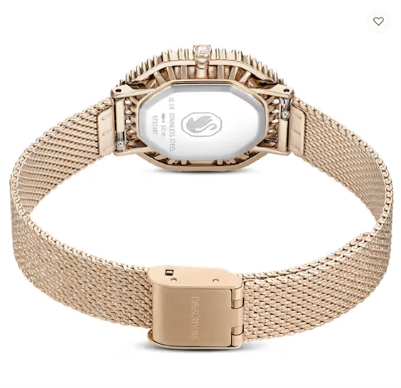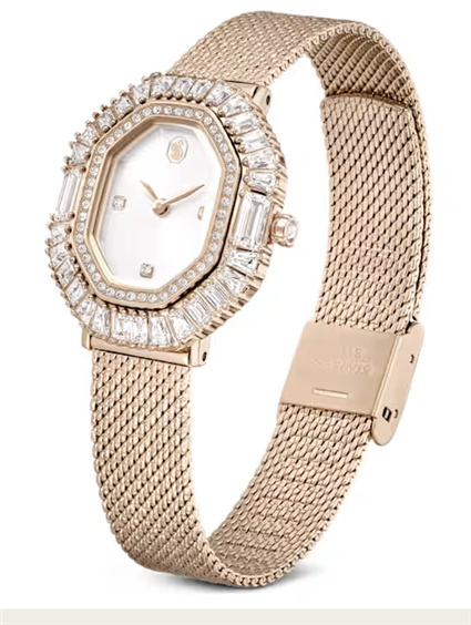 Questo innovativo orologio è una creazione unica nel suo genere che combina il design distintivo con la maestria della luce. Realizzato con autentico savoir-faire, l’orologio è ispirato alla famiglia di gioielli Matrix e presenta una cassa in acciaio inossidabile di 13 x 18 mm con finitura in tonalità oro champagne. La lunetta è presentata nell’iconica forma ottagonale di Swarovski e include un meraviglioso mix di 78 cristalli Cry e Swarovski Zirconia taglio Round e Fancy incastonati. Si crea così una radiosa cornice per il quadrante minimalista con motivo sunray, che mostra elegantemente tre indici delle ore in cristallo e un logo cigno. Un singolo cristallo è inoltre posizionato all’interno della corona, mentre intorno al polso, il lusso è ulteriormente accentuato da un bracciale in mesh regolabile. Questo orologio è resistente all’acqua fino a 50 m e simboleggia il moderno lusso di Swarovski nella sua massima espressione. Articolo nr.: 5732501 Collezione: Matrix Dimensioni della cassa: 30 x 25 mm Spessore della cassa: 7 mm Lunghezza indossabile della fascia (minimo - massimo): 12.5 - 19 cm Larghezza della fascia: 1.2 cm Materiale: Cristalli, PVD tonalità oro champagne, Zirconia Colore: Color oro Tipo di fermaglio: Fermaglio ripiegabile su se stesso Materiale del cinturino: Metallo Meccanismo dell'orologio: Quarzo