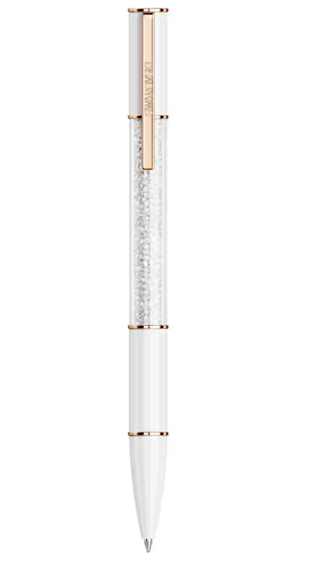 La penna a sfera Crystalline Lustre combina creatività e lusso. Questo distintivo strumento per la scrittura presenta un fusto rotondo bianco e dettagli placcati color oro rosa che includono una pratica clip con inciso il nome Swarovski. Al suo centro, questo accattivante design è illuminato da circa 480 luccicanti cristalli, ciascuno meticolosamente aggiunto utilizzando l’iconica tecnica Crystalline. Una straordinaria aggiunta alla tua scrivania o una notevole idea regalo per gli scrittori della tua vita. I refill di inchiostro nero e blu sono disponibili per l’acquisto negli Swarovski store. Articolo nr.: 5694174 Collezione: Crystalline Lustre Dimensione: 14.4 x 1.1 cm Materiale: Cristalli, Laccato bianco, Placcato color oro rosa Colore: Bianco Colore dell’inchiostro: Nero