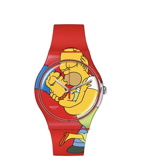 SWEET EMBRACE Parte della collezione The Simpsons, questo speciale per San Valentino presenta Homer e Marge Simpson stampati sia sul quadrante che sul cinturino. La cassa è rossa e il cinturino e il passante sono sempre rossi con il logo dei Simpson. TM & © 20th Television. Matt Groening SO29Z120