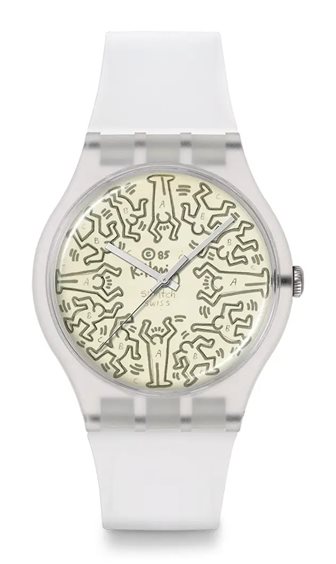 FROM THE ARCHIVE Il quadrante beige chiaro opaco di questo segnatempo presenta i disegni, la firma e il copyright dell'artista Keith Haring in grigio, nonché la sua interpretazione del logo Swatch. Le lancette argentate di ore, minuti e secondi indicano l'ora sotto il vetro biosourced. Completano l'orologio una cassa trasparente opaca biosourced e un cinturino, un passante e una fibbia trasparenti opachi.