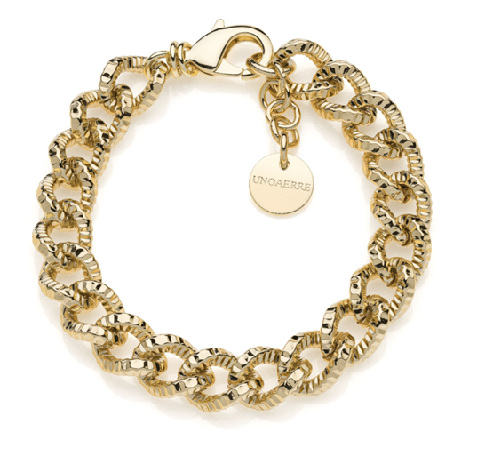 Bracciale di catena grumetta ovale in finitura godronata diamantata con chiusura a moschettone ed allungamento. Misura 19 cm. Una nuova luminosissima finitura per la più amata delle catene gioiello. Indossa questo bracciale per impreziosire ogni tuo look, mixalo ad altre catene in diverse finiture e grandezze e crea il tuo stile unico.