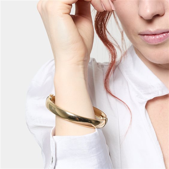 Bracciale rigido a manetta in bronzo con placcatura in oro giallo e finitura lucida. Diametro 19 cm.