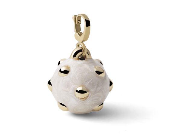 Charm pendente a forma di mina e smalto bianco madreperlato. Unoaerre rivisita un grande classico dell'oreficeria traendo ispirazione direttamente dagli archivi storici anni '50. Tornano così le iconiche Mine, nate nel secondo dopoguerra con l'intento di esorcizzare le paure e le sofferenze passate. Simbolo di rinascita e nuova prosperità, furono indossate anche da Sophia Loren nell'intramontabile film "Ieri, Oggi e Domani".