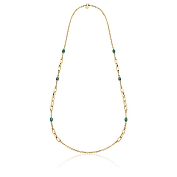 Collana lunga con catena forzatina fantasia, malachite verde e chiusura a moschettone. Lunghezza 113 cm. La catena fine e leggera è pensata per mettere in risalto il colore intenso degli elementi in malachite che si alternano lungo la collana. Un gioiello iperfemminile per conquistare al primo sguardo.