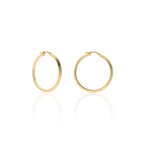 Orecchini a cerchio in finitura diamantata. Chiusura a baionetta. Diametro 3,00 cm.