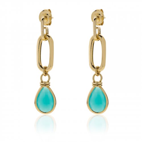 Orecchini lunghi con maglia di catena forzatina in bronzo con bagno in oro giallo 24 kt e pendente a goccia con cristallo turchese. Glamour ed eleganti, questi orecchini sono l'accessorio ideale per dare un tocco di positività ed energia ad ogni look. Abbandonati al potere magico delle pietre ed indossali insieme alla collana e al bracciale per stupire. Materiale: Bronzo Colore: Dorato Pietra: cristallo color turchese Lunghezza: 5,50 cm Bagno galvanico: oro giallo 24 kt Finitura: lucida Chiusura: perno e farfallina