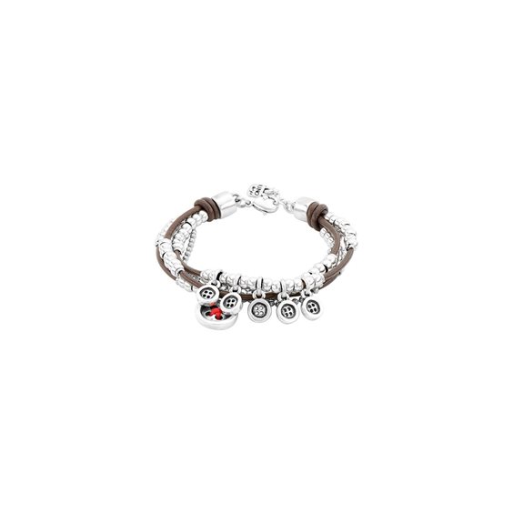 Bracciale dal puro stile boho chic di UNOde50 composto da varie strisce di cuoio marrone con elementi decorativi in metallo bagnato nell’argento e con charm a forma di bottone cucito in rosso e altri di minore grandezza. Un accessorio che ti accompagnerà nel tuo quotidiano. Un gioiello di UNOde50, prodotto in Spagna e realizzato secondo un processo interamente artigianale.