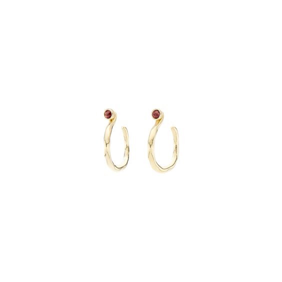 Orecchini di cerchio bagnati nell'oro e ornati da pietre di cristallo SWAROVSKI® ELEMENTS di un romantico colore rubino. Si legano alla perfezione con le personalità più dolci. Il suo semplice e versatile design lo converte nell'accessorio ideale per tutti i tipi look ed è stato realizzato in Spagna da UNOde50 secondo un procedimento artigianale.