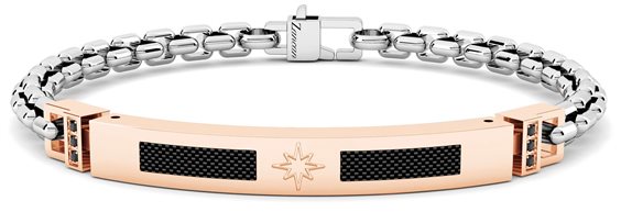 Bracciale in acciaio 316 L Con targa centrale in pvd rosa, righe fibre di carbonio e rosa dei venti centrale