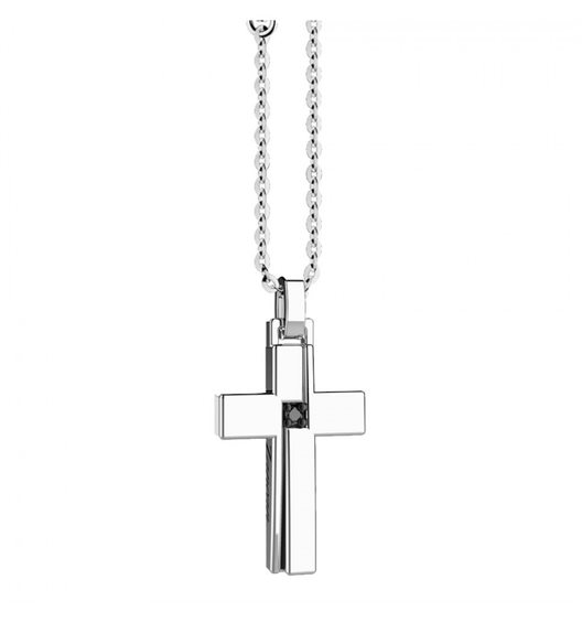 Collana da Uomo della Marca Zancan, il gioiello è composto da una catena maglia Rollò lucida in Argento Bianco 925, modello girocollo impreziosito dalla lavorazione lucida del pendente, a forma di croce latina con spinello nero incastonato, la lunghezza è 50 cm, la chiusura è ad maglia a moschettone.
