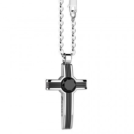 Collana Zancan in argento con pendente a croce e onice centrale. Decorazioni color nero. Chiusura a moschettone.